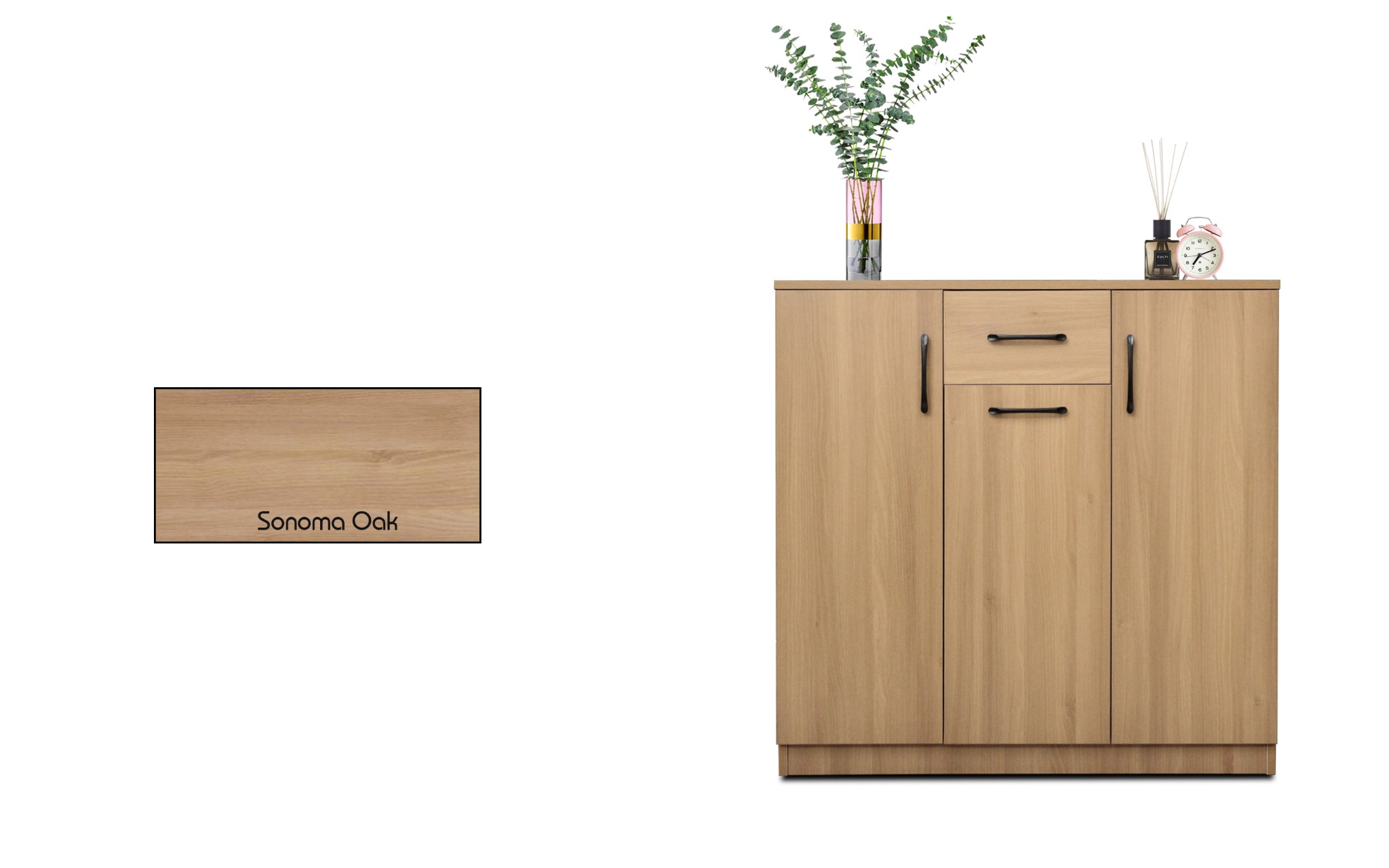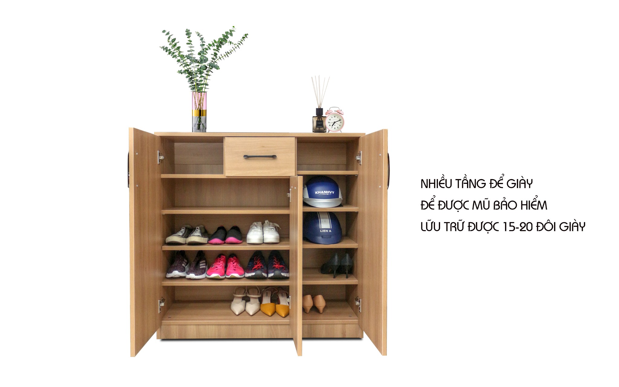 Mỗi gia đình sẽ có lúc cần đến 1 tủ đựng giày và tủ giày Thịnh Phát 06 sẽ là một trong những lựa chọn cho những dịp như vậy. Được sản xuất từ gỗ công nghiệp MDF với thiết kế vô cùng ấn tượng đi kèm màu sắc gỗ sồi Sonoma. Phía sau 3 cửa mở là 10 kệ để giày dép, nón bảo hiểm. Đi cùng với đó là 1 hộc kéo dành cho những vật dụng cá nhân của bạn.